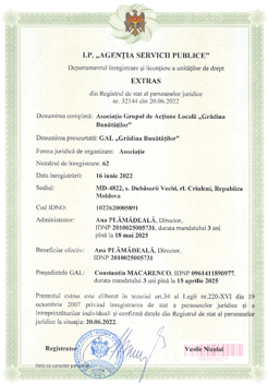 Află detaliiExtrasul din Registrul de stat al persoanelor juridice confirmă datele oficiale de identificare ale Asociației GAL „Grădina Bunătăților”, conform înregistrării efectuate la Agenția Servicii Publice.